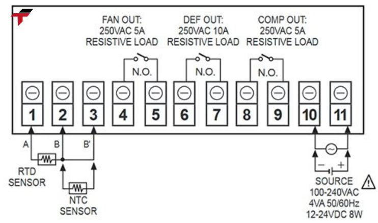 | Outputs | Compressor, Defrost heater, Fan (relay) |